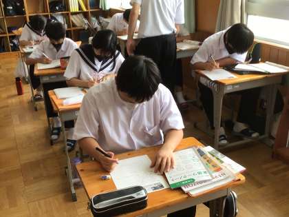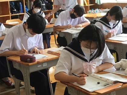 英語の授業の様子です。「to 不定詞」を使った英作文で自分の夢を大いに語った2年生。問題にも意欲的に取り組んでいます。