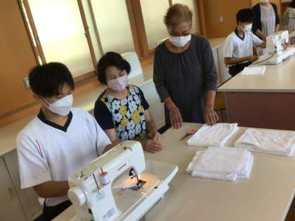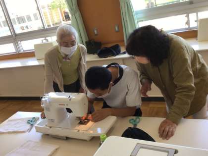 コロナ禍のため、少ない人数での実施となりましたが、ミシンの扱い方のこつを教えていただいたり、意欲的な姿を褒めていただいたり、地域の方と温かな交流の時間となりました。