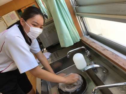 コロナ禍で調理実習が行えていない状況が続きますが、いつでも再開できるように願いを込めて取り組む姿が見られました。