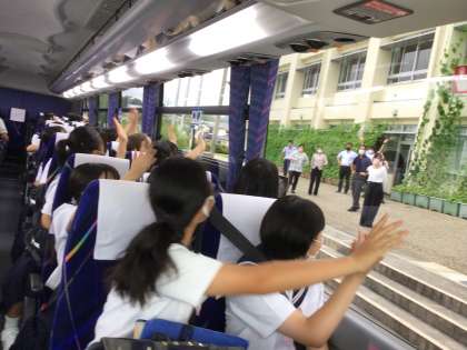 楽器の運搬を終えて乗車した生徒たちは、納得のいく演奏をしてきてほしいと願う先生方に見送られながら、出発しました。