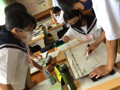上の写真は、理科の授業の湯雄です。鉄と金の比重を利用して、物質を見分ける方法をそれぞれのが考え、意見をすり合わせながら練り上げているところです。