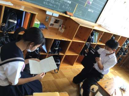 中央と下の写真は、総合学習の発表に向けて練習をしているところです。ペアを組んで、お互いの発表を聴いてアドバイスしたり、タブレットで撮影して本人が確認したりできるように取り組んでいます。