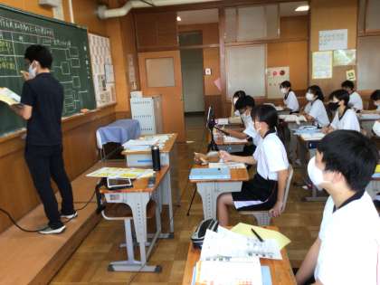 下の写真は、数学科の授業です。二元一次方程式を学習する中で、変化の割合の求め方を習得しました。