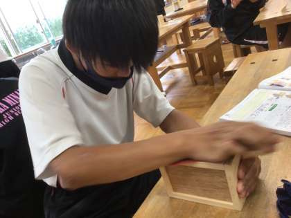 上の写真は、技術の授業です。自分の作品を紙やすりで磨き上げています。あまりの速さに残像が写っています。