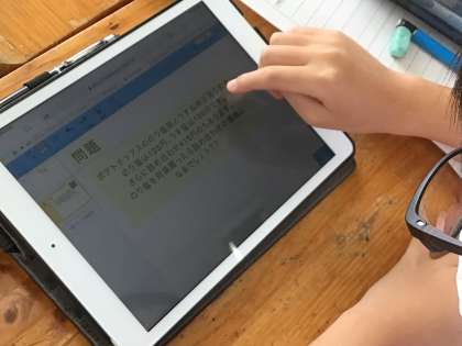 中央の写真は、数学の授業です。学習用タブレットを使って、本格的な方程式の問題を作っています。