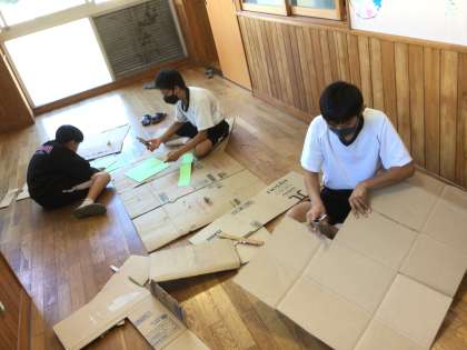 さまざまな防災体験ブースで来客した方々を迎えます。より楽しめるように工夫したり、必要な道具を作成したりして、準備を進めています。