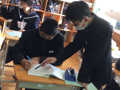 上の写真は、数学の授業です。反比例のグラフ問題に取り組み、理解が曖昧なところをお互いに教え合っているところです。