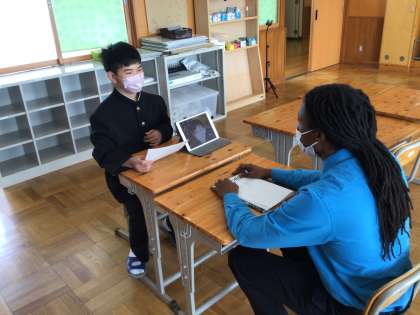 下の写真は、英語の授業です。ALTの先生に家族や友達を英語で紹介する、パフォーマンステストの様子です。