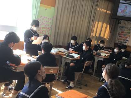上の写真は、1年生の社会の様子です。世界の特色ある農業について、グループで話し合った内容を、学級に紹介しているところです。