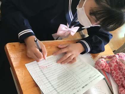 下の写真は、3年生の数学の様子です。授業の最後にリフレクションシートを使って、本日の学習目標に対する自己評価をしたり、授業での学びを自分の言葉で書き込んだりしています。