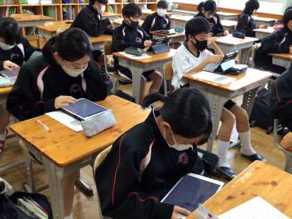 中央の写真は、環境委員会です。フジバカマとアサギマダラについて、生徒会だより「みなみだより」に掲載する記事をタブレットでまとめています。