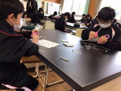 下の写真は、美化委員会です。年末の大掃除に向けて、「いいねカード」を作成しているところです。