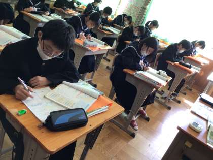 下の写真は、社会の授業です。大事な語句は教科書で確認しながら、授業のまとめプリントに取り組んでいるところです。
