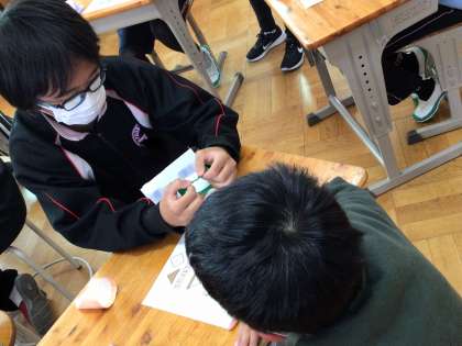 お互いに自己紹介をした後は、お待ちかねの紙飛行機作りです。中学生たちは「こうやって折るといいんだよ」「上手に折れたから、いっしょに飛ばしに行こう」と進んで関わっていく姿が見られました。