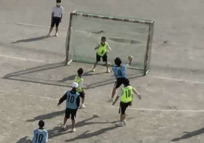 上の写真は、体育です。ハンドボール競技の種目の特徴を学んで、ゲーム形式で試しているところです。
