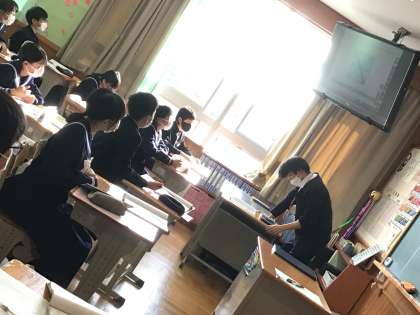 下の写真は、数学です。対称図形について、デジタル教科書を使って視覚に訴える説明が行われています。