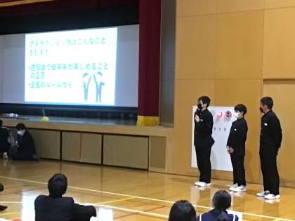 在校生全員がスタッフとなり、活動していきます。本日は、1・2年生の生徒が体育館に集まり、各スタッフのリーダーから活動内容が紹介されました。その後、各教室に戻り、希望するスタッフをフォームスで回答しました。