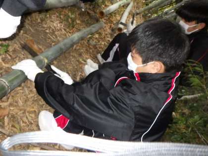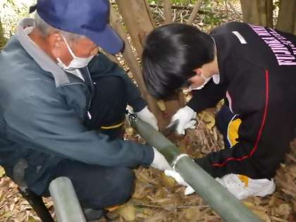 今年度も地域の方の厚意で、山から見事な竹を分けていただきに伺いました。初めて使う竹用の鋸を力強く引き、仲間と協力して必要な長さを切り出しました。