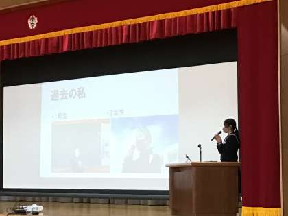 全校集会の中で、3年生の生徒代表が意見発表を行いました。