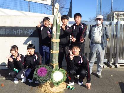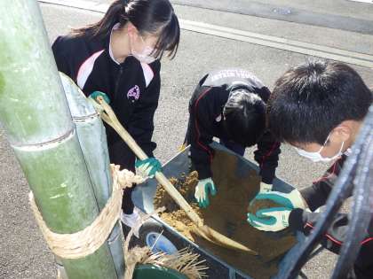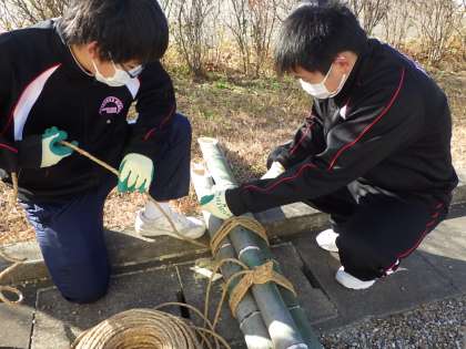 3本の竹の節を縁起の良い「七・五・三」に合わせ、縄を使って、7括り・5括り・3括りでまとめました。生徒たちは慣れてくると力強く束ねていく姿が見られました。こもが巻かれた土台に葉牡丹も植え付け、立派な門松ができあがりました。