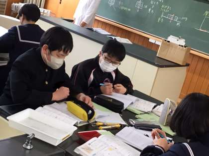 上の写真は、理科の授業です。器具を用いた実験で摩擦力について考えているところです。