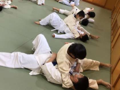 下の写真は、体育の授業です。柔道の袈裟固めを使って相手を押さえ込む練習をしています。