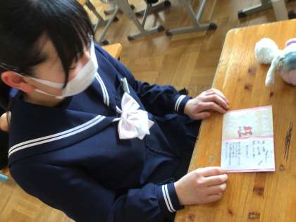 3年生一人ひとりに招待状が届きました。1・2学級の生徒たちが製作した和紙を使って作られています。3年生の生徒からは「午後がとても楽しみです」「いよいよ私たちも送られる番が来たと思うと不思議な感じがします」という声が聞かれました。