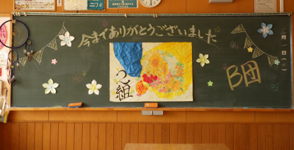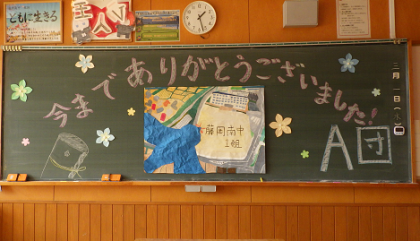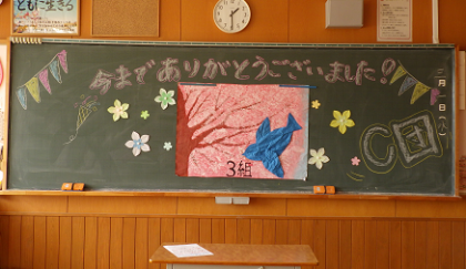 送桜会を終えて教室に帰った3年生を出迎えたのは、スタッフによる黒板アートです。