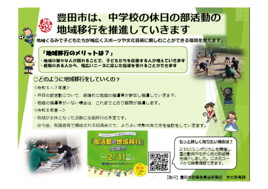 豊田市学校教育委員会教育部 学校教育課が発行した「休日の部活動の段階的な地域移行について」を掲載しました。
