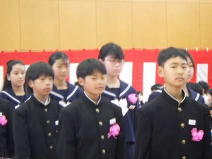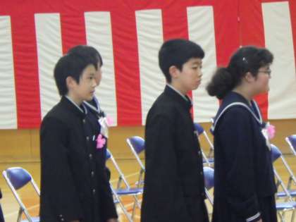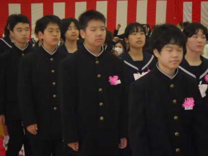 保護者と教職員の拍手の中を、制服に袖を通した新入生が体育館に入場しているところです。