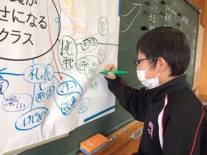 目指すクラス像に到達するために必要なことをグループで話し合ったり、理由を明確にして行ったりする中で、みんなで決めた級訓になりました。