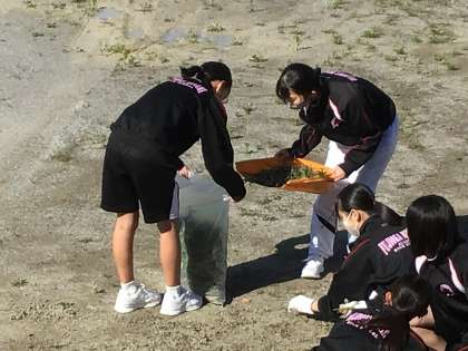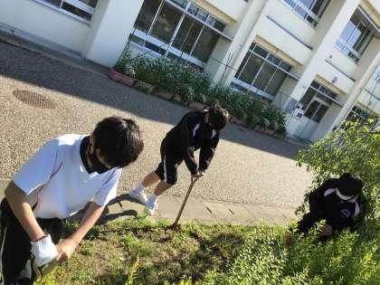 体育祭に向けて運動場で勢力を増す前に雑草を抜いたり、海を渡るチョウ「アサギマダラ」が飛来するようフジバカマ園の造成作業に取り組んだりしました。