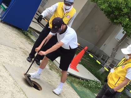 仮設トイレ設営運用ブースです。マンホールの蓋を開けるなど、実際の動きの確認をしました。