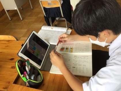 中央の写真は、2年生の国語です。熟語の構成について学びました。学習用タブレットを使って、似た意味の組み合わせや反対の意味の組み合わせの熟語を、グループで分類しました。