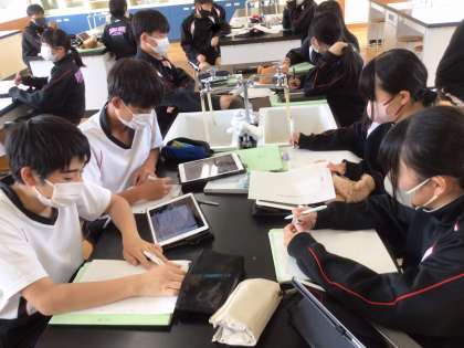下の写真は、3年生の理科です。記録タイマーを用いた等速直線運動の実験結果をもとに、加速度の変化についてグループで話し合いをしているところです。