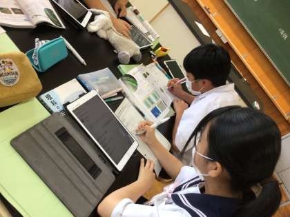 上の写真は、理科の授業です。無性生殖の「分裂・出芽」と「栄養生殖」のそれぞれの特徴について、タブレットを使って調べたり、プリントに自分の考えをまとめているところです。