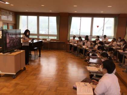 下の写真は、音楽の授業です。スメタナ作曲「モルダウ」の鑑賞を行っているところです。楽器の音色からイメージをふくらませ、曲想を豊かにイメージしました。