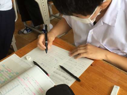 英語の授業の様子です。単元テストを終えて今回の学習内容について、まとめのレポートを作成しているところです。「if」を用いた条件節の使い方について例文を交えながら、それぞれがレポートを作成する姿が見られました。