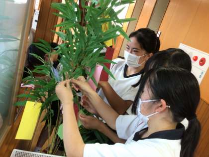 2年生の教室前に七夕の竹が設置されています。 生徒たちは思い思いに願いを書いた短冊を結わえています。