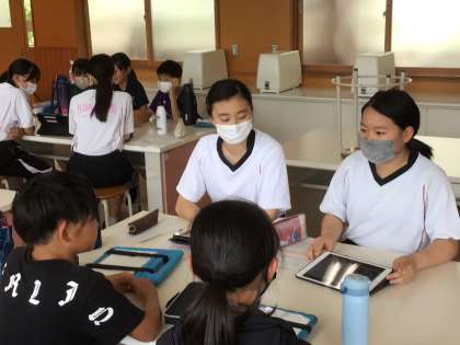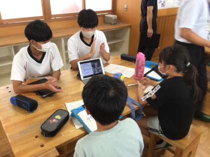 3年生は、昨年度の研究成果である「47災害から考える防災」について、小学生にプレゼンテーションを行いました。小学校4年生にわかりやすいように言葉を選んだり、補足説明を加えたりするなど、相手を意識して接するため、どのグループでも笑顔の花が咲いていました。