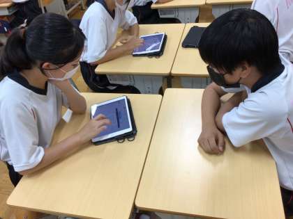 中央の写真は、生徒議会の活動の様子です。全校生徒にデータ配信される「みなみだより」を学習用タブレットを活用して作成しているところです。