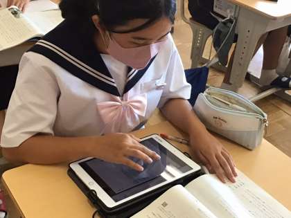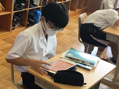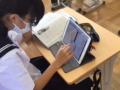 1年生の国語の授業です。主人公ではない登場人物の視点で、物語をリライトしているところです。登場人物の気持ちに寄り添おうと、本文に着目している姿が見られました。