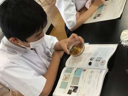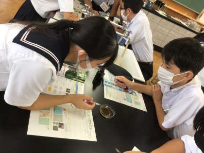 培地を用いた有機物の分解についてヨウ素液を用いて変化を観察し、食物連鎖との関わりについて考えを深める時間になりました。