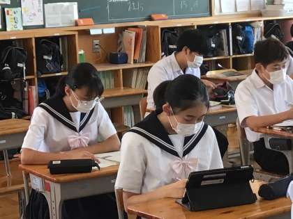 上と中央の写真は、休み時間の様子です。下の写真は、テストに取り組んでいる様子です。