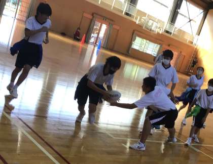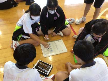 タグラグビーで、相手のT字ディフェンスを突破する作戦をチームで考え、実際に試合の中で挑戦しました。試合の様子は学習用タブレットで動画撮影を行い、さらに修正を加えて作戦の質を上げ、トライを上げる生徒たちの姿が見られました。