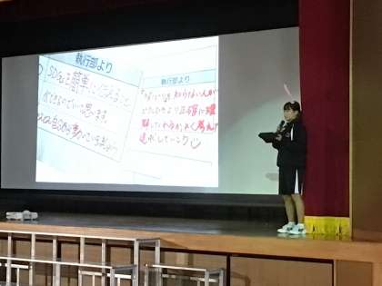 生徒会長からは、ここまで生徒会役員と全校生徒がリフレクションシートを介してやり取りをしてきた中で、前向きに取り組む姿や仲間と楽しむ姿が感じられたことや、それが校内テーマ「ピラミッド」の礎になっていると思ったことなどが語られました。