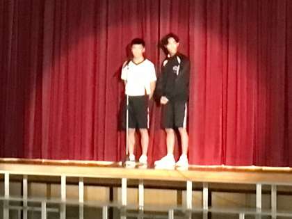 昨年、中山小学校の6年生にコントを披露したコンビが満を持して、有志発表に参加しました。ふれあいフェスティバルに訪れた来場者とブースの担当者に扮し、テンポの良い掛け合いに場内も笑いながら惹き込まれていきました。ネタを自分達で作ったところもポイントです。