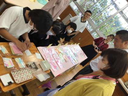 マーブリング技法を駆使して色付けされた、絵本作家いわさきちひろの作品を彷彿とさせる淡く温かな色合いのポチ袋や、丁寧に漉かれて型抜きされたカードやハガキは可愛らしく包装されています。