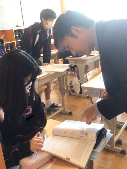下の写真は、数学の授業です。教師がそれぞれの進度を確かめながら机間巡視を行い、声かけやアドバイスを行っているところです。