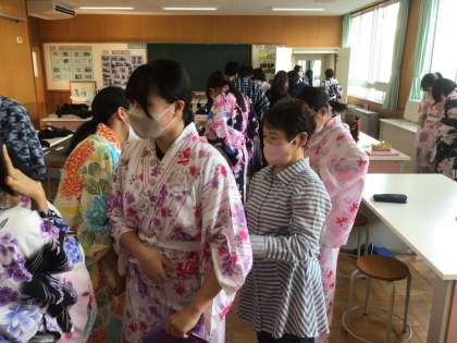 本日、地域ボランティアの方々を講師にお迎えして、2年生が浴衣の着付け実習を行いました。